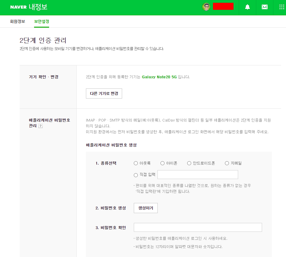 6. 진행하기 전에 네이버 내 정보에 들어가서 보안설정 - 2단계 인증 관리에서 애플리케이션 비밀번호 관리를 통해 파이썬 스크립트에서 사용할 비밀번호를 하나 생성한 다음 위의 스크립트를 진행해야 한다. 그렇지 않으면 자동화 스크립트에서 로그인하는 것을 네이버는 싫어해서 그림 캡챠를 돌려 로그인을 방해(?)하는 처리를 하고 있다.