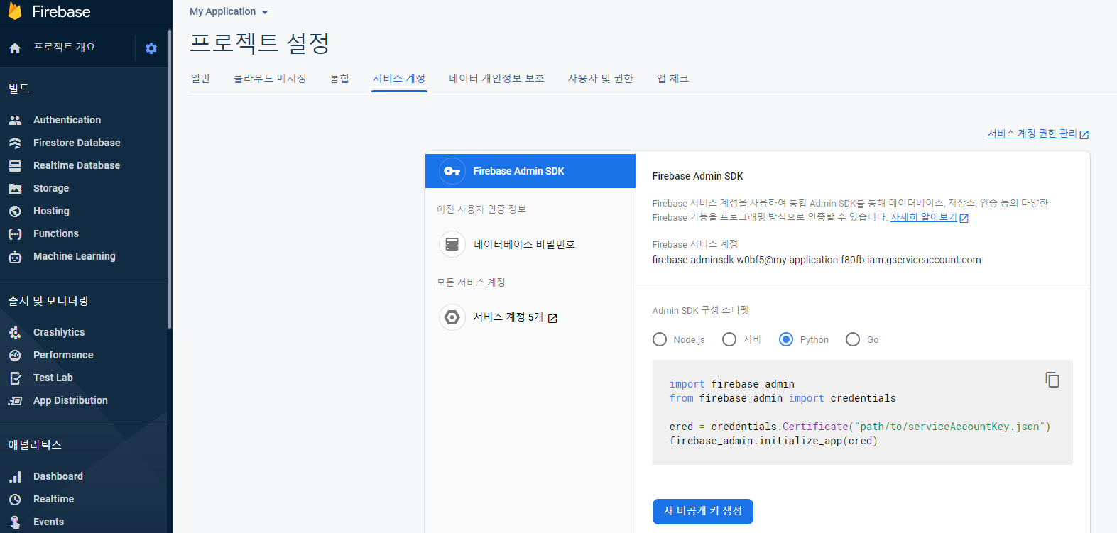./services_firebase.json 이 파일이 있으면 인증서를 대신할 수 있다. 이건 어디서 얻는 것인가 ? firebase의 console 에서 프로젝트 설정을 가면 서비스 계정이라고 탭이 있고 거기서 새 비공개키 생성 을 클릭 하면 자동으로 생성이 되는 json 파일 있다. 그 파일의 이름은 프로젝트 이름을 따라서 생성이 되기 때문에 길다... 그걸 좀 줄였다. 이 파일은 android 개발할 때도 받았던 파일 이였다. 같은 걸 쓰면 될 것을...