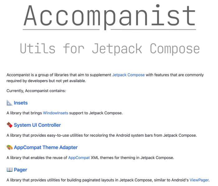 구글에서 만든 ❤.Jetpack compose용 유틸리티 모음입니다. Jetpack compose는 디자인을 위한 Android 앱 개발의 새로운 표준입니다. Navigation-Animation, Permission 등과 같은 많은 경우에 도움이 될 수 있습니다.