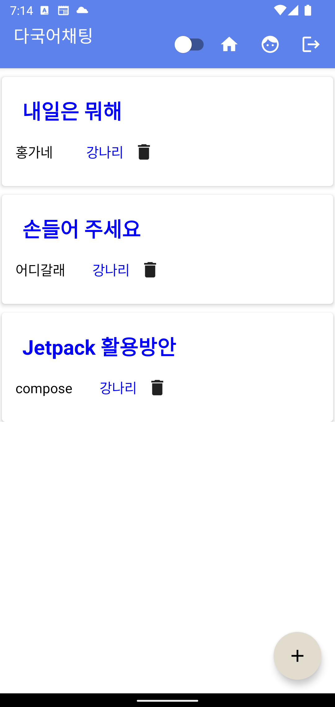 | 안드로이드 앱 만들기 : 멀티 언어 채팅 앱 만들기 (Jetpack compose 활용해 보기) (3) | 2022.04.24 |