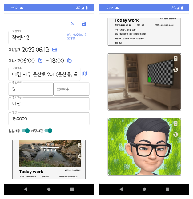 작업을 등록하여 구인 게시물을 등록할 수 있습니다. 긴략한 내용으로 등록을 지원하며, 이미지는 3개 까지만 등록할 수 있습니다. 등록된 구인게시물을 이용해서 구인시 참고할 수 있습니다.