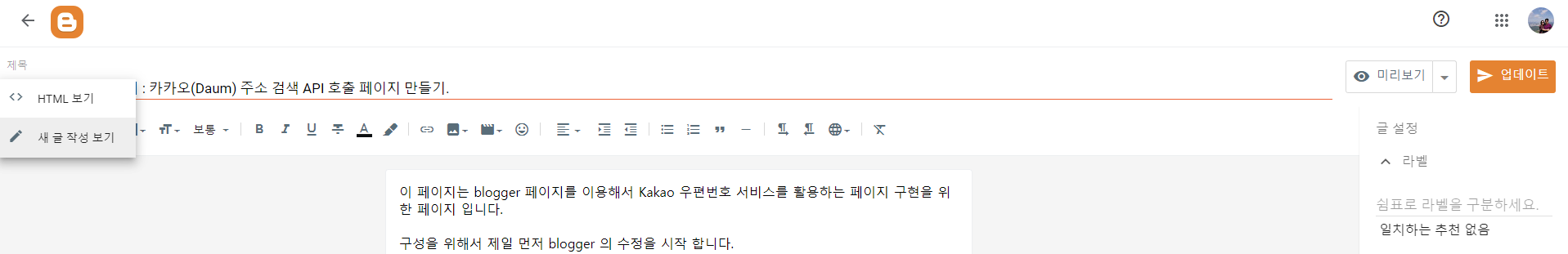 이 페이지는 blogger 페이지를 이용해서 Kakao 우편번호 서비스를 활용하는 페이지 구현을 위한 페이지 입니다. 구성을 위해서 제일 먼저 blogger 의 수정을 시작 합니다. 수정할 때 HTML 보기를 선택