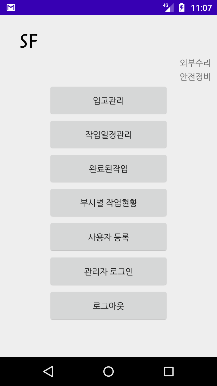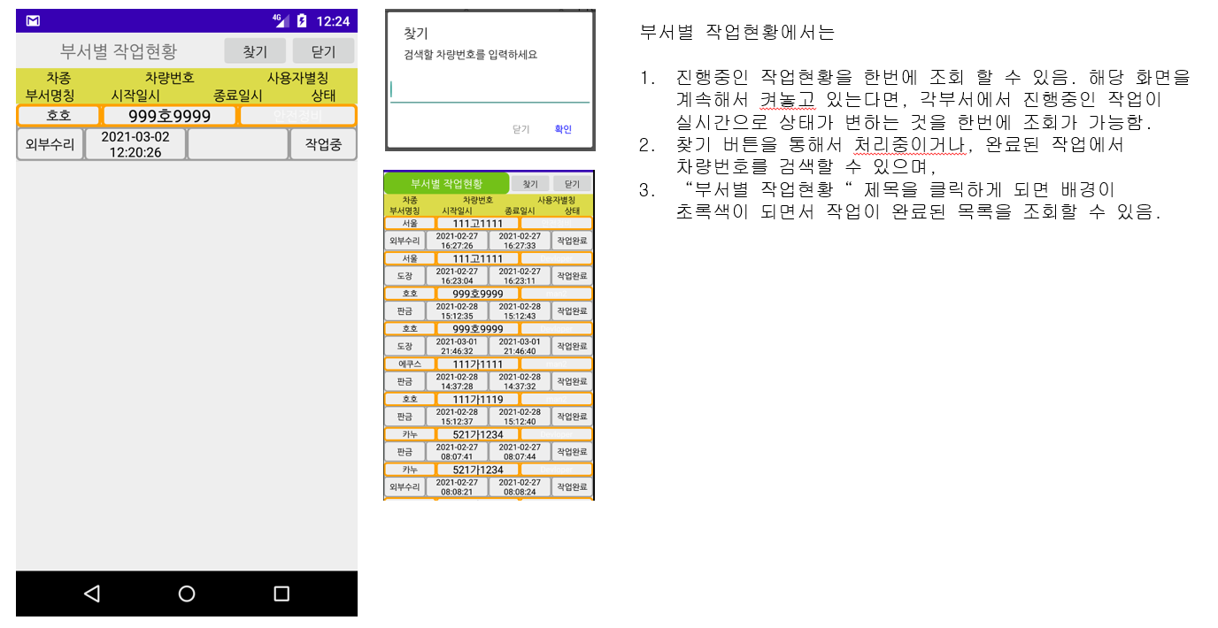 이 앱은 작은 정비업소등에서 사용할 수 있도록 개발된 앱입니다. 1. 이앱은 5가지 정도의 공정을 가지고 있는 정비업소에서 각 공정별로 입고되는 수리대상 품목(이하 수리차량이라 명칭)을 입