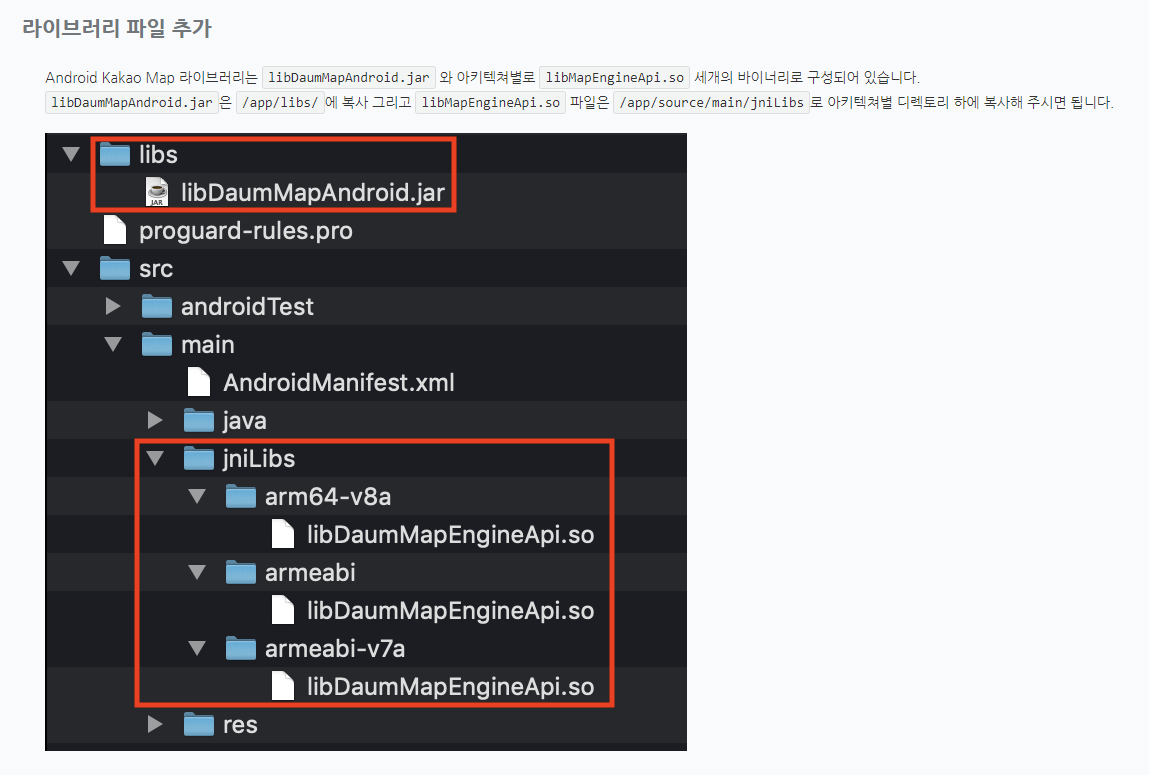 얼추 위 가이드가 말해주는 것과 비슷한 구조가 되게 jar 파일과 so 파일들이 위치될 수 있도록 경로에 복사를 해 주었다.