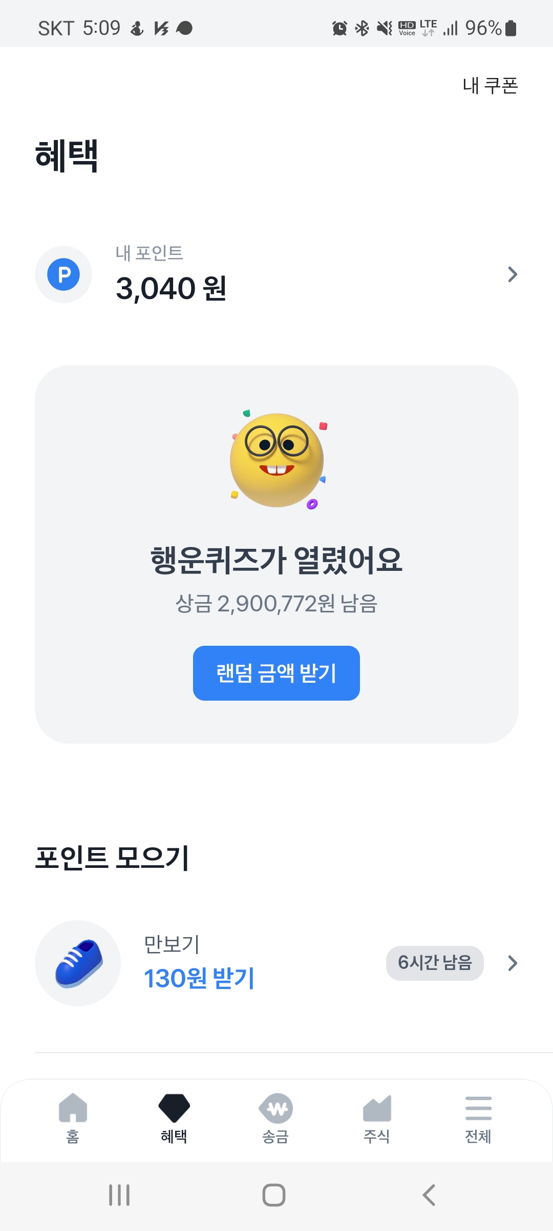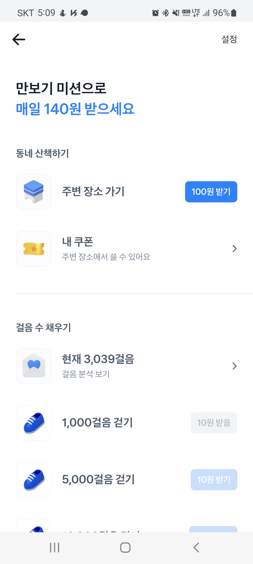 토쓰에서도 만보기 미션을 주는 데, 하루에 만보를 걸으면 최대 40원까지 충전이 되며,
