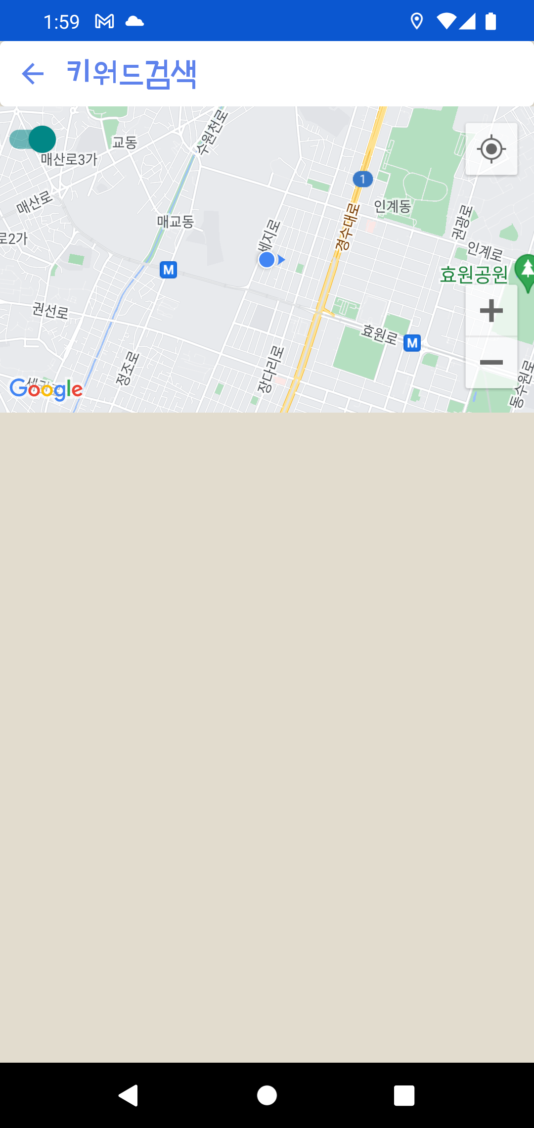 아직은 예전 java 코드에서 kotlin 코드로 이전 작업을 하는 중이라 미완성의 모습으로 보이는 데, 일단, 앱에 구글맵을 넣어 보았다.