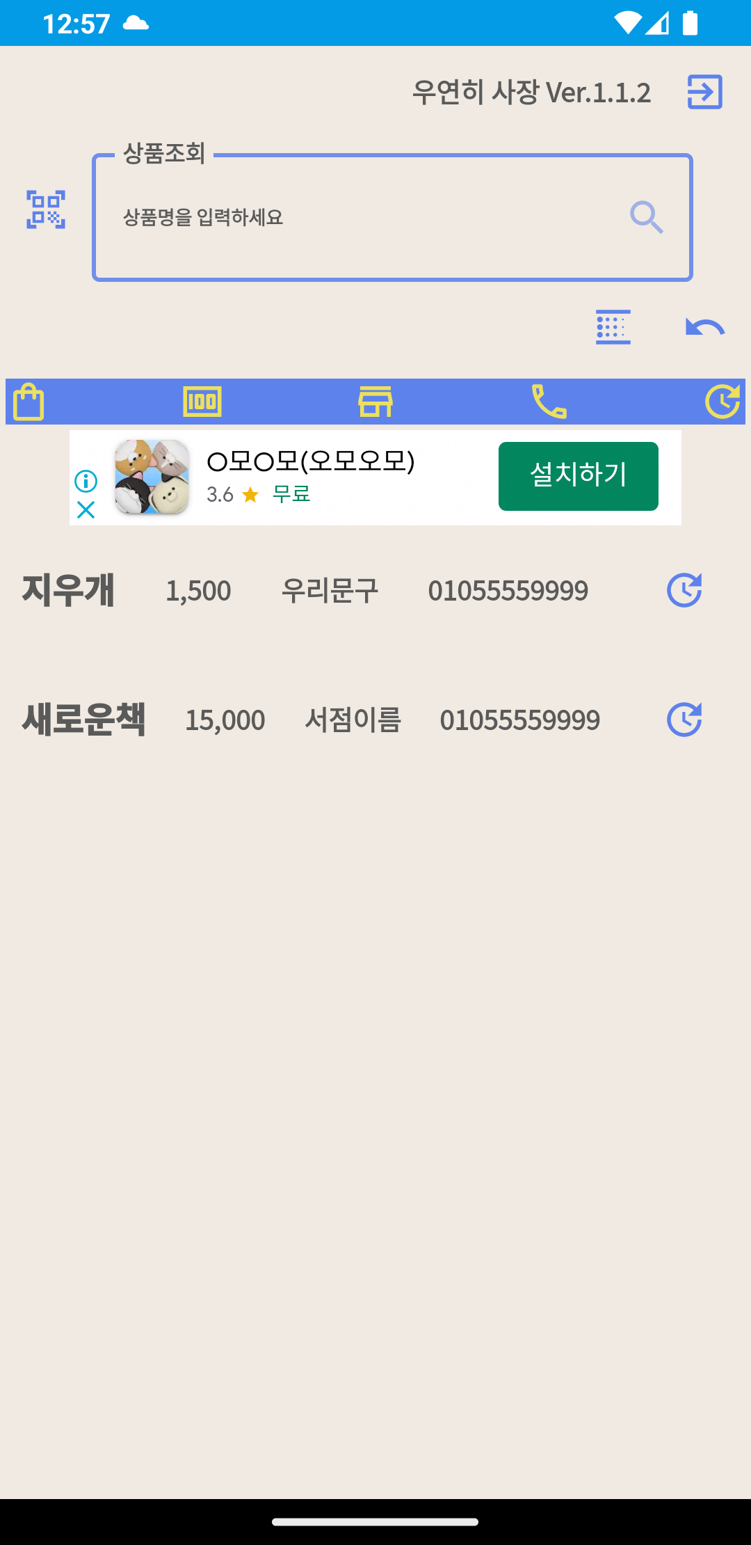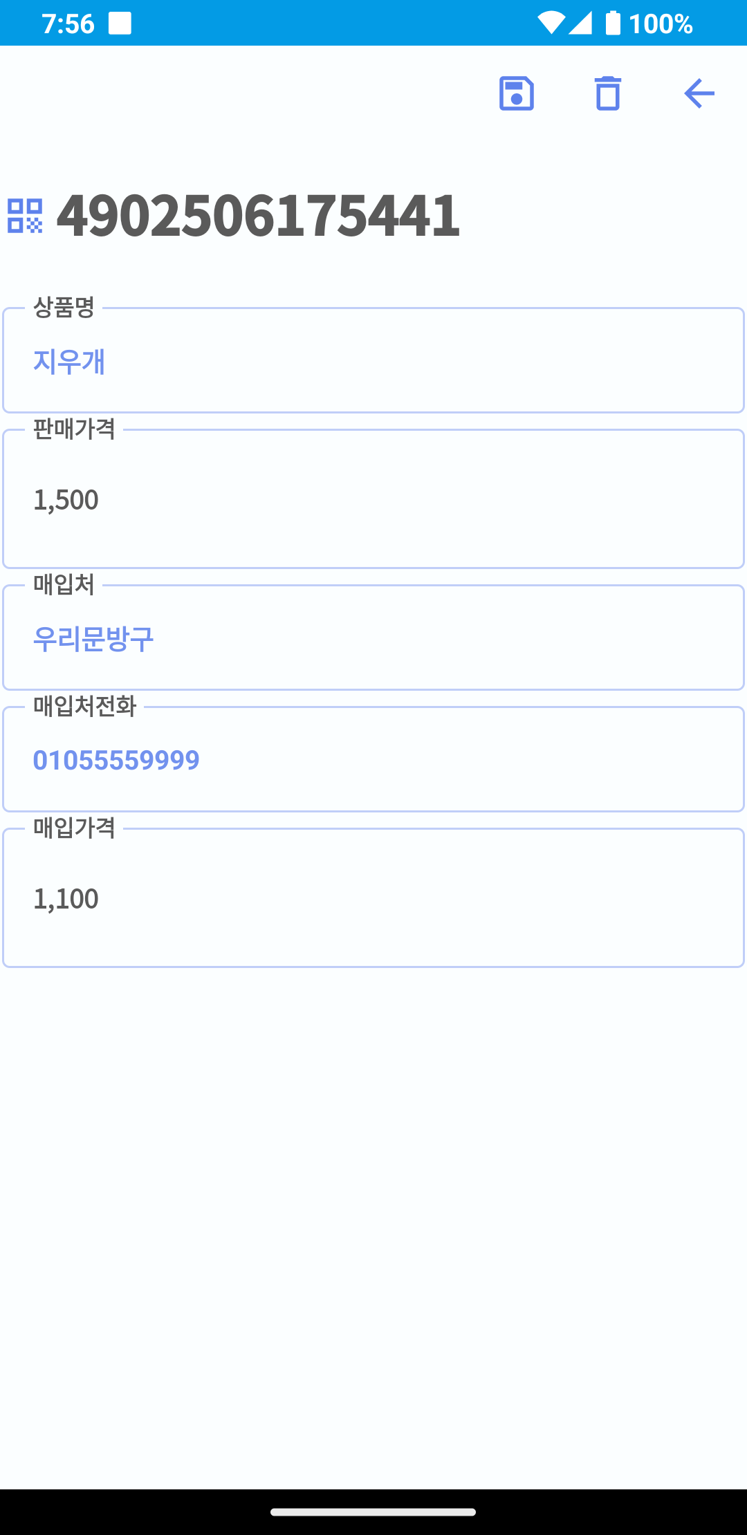 상품정보의 등록은 메인 화면에서 바코드 아이콘으로 바코드를 스캔 하면 등록 되지 않은 상품의 경우 상품을 등록 하는 화면으로 자동 이동 합니다.