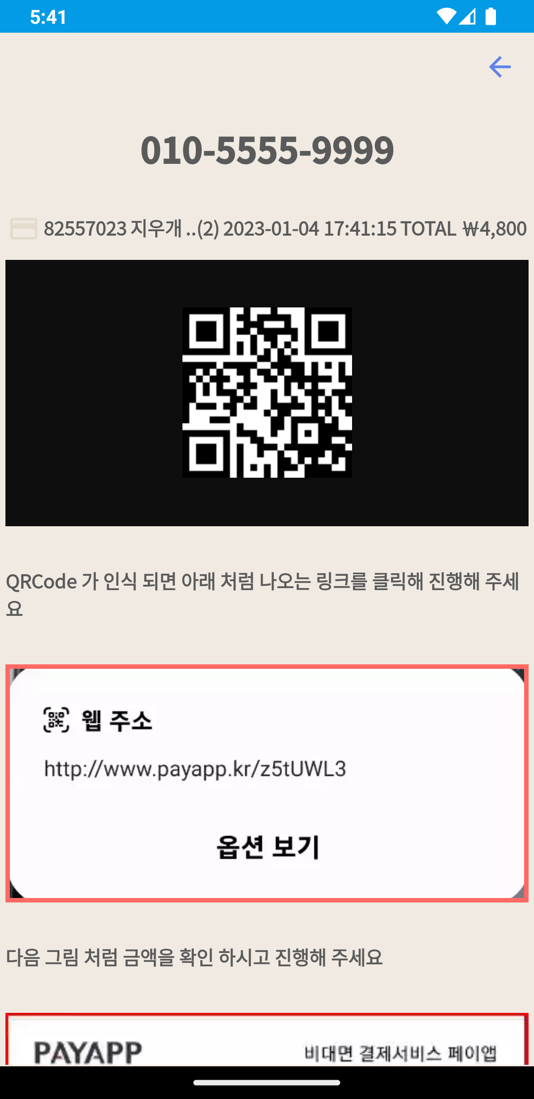 이 화면 상태에서 고객의 휴대폰으로 카메라 앱을 열어서 QR코드를 보여 죽게 되면 결제를 요청하는 화면으로 이동 하게 됩니다.