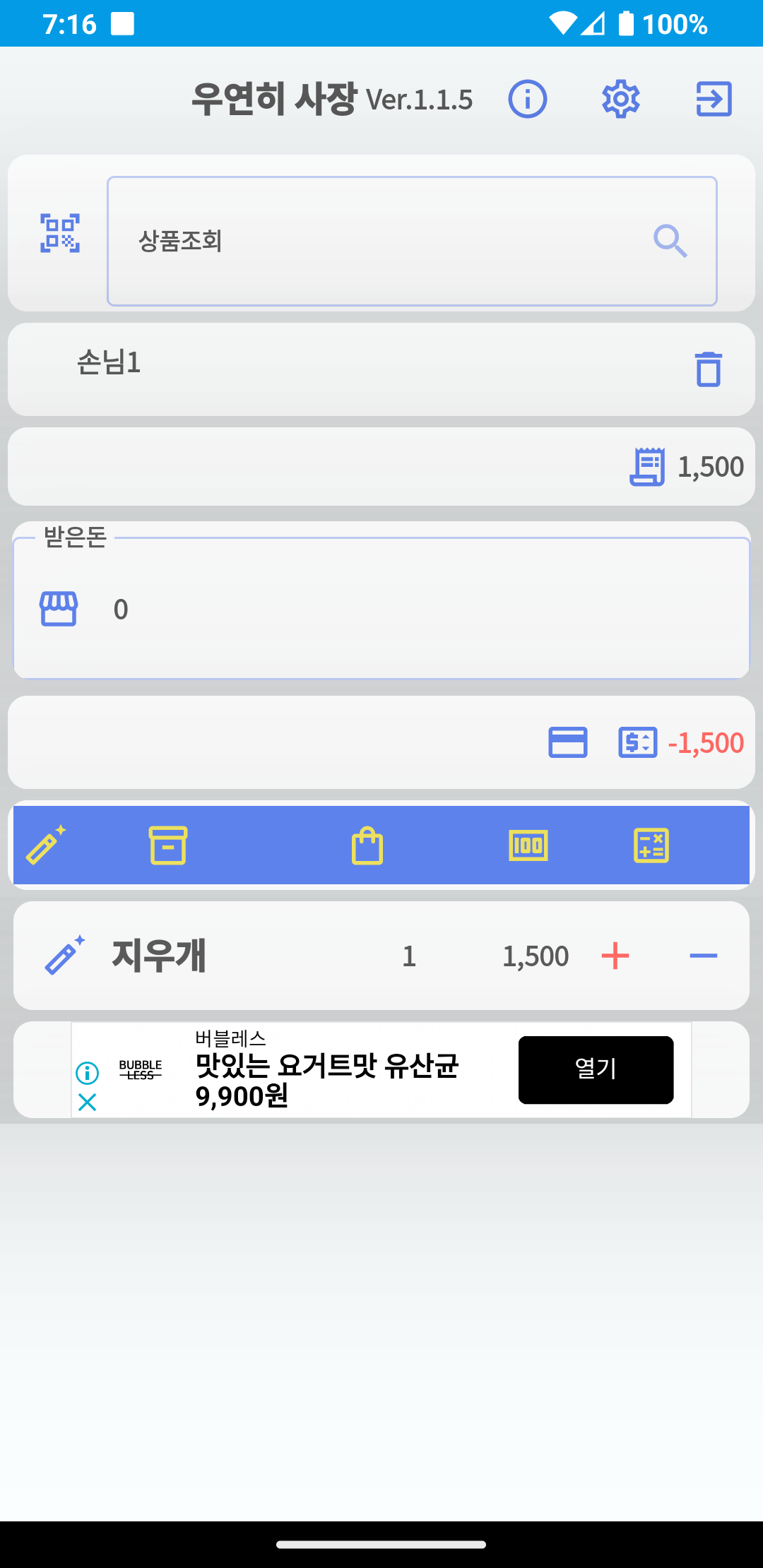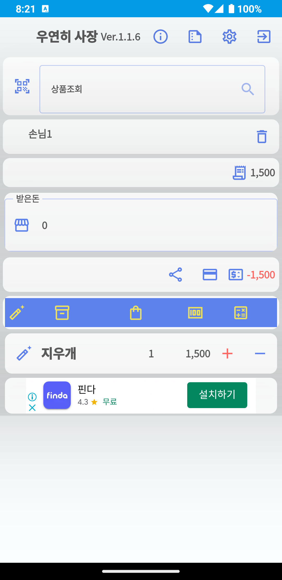 현금으로 판매하는 경우에는 반은돈에 금액을 입력하면 차액이 자동 계산 되어 아래 표시 됩니다.