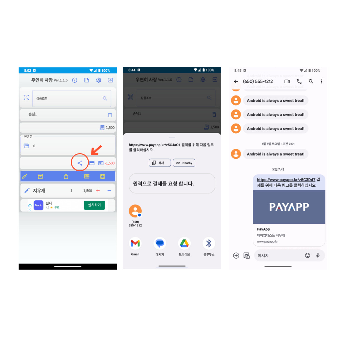 이제 결제 요청도 공유해 (Ver 1.1.6 ~) 보세요. 방문 하지 않은 고객에도 결제를 요청할 수 있습니다.