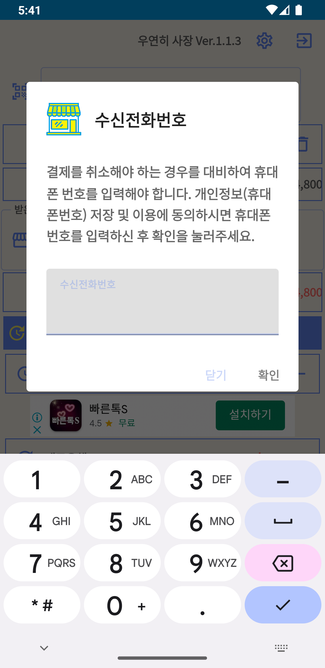 메인 화면에서 간편 결제 이미지 클릭 하면 수신 전화번호를 입력 받습니다.
