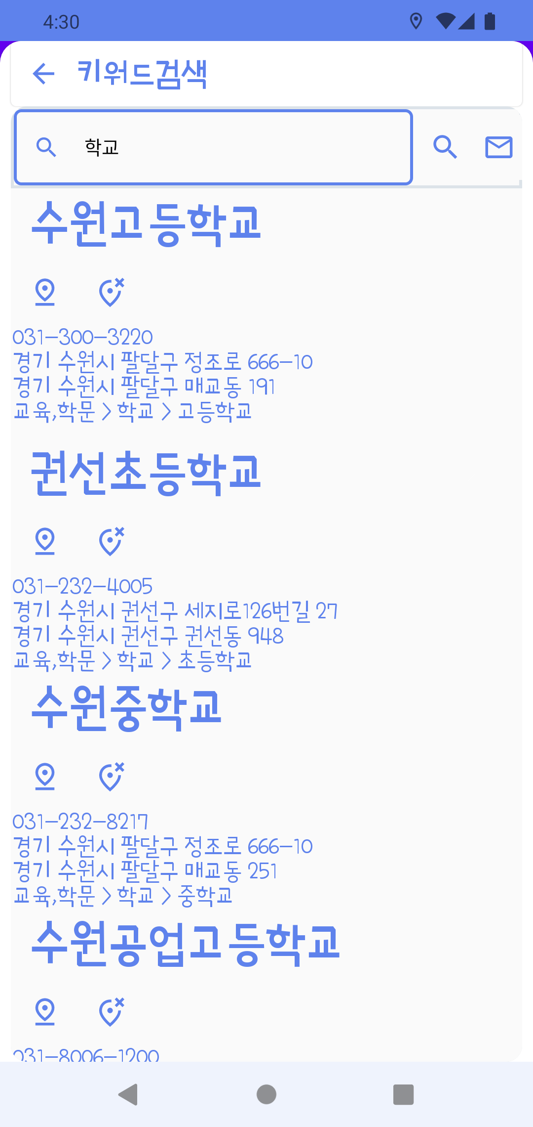 선택하고 검색을 하게 되면 키워드 검색과 같이 지도상에 위치 정보를 표시합니다.