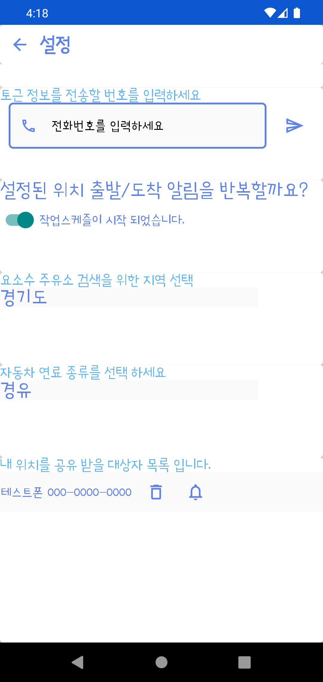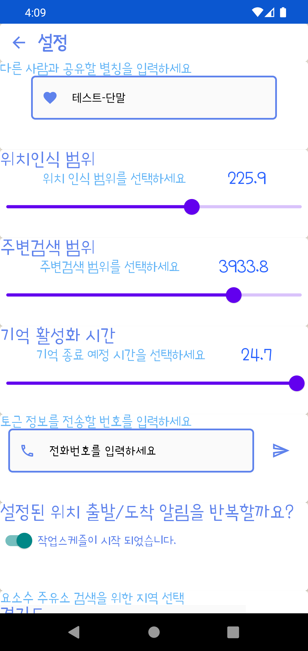 설정에서 등록하는 지역에 따라 요소수 주요소 정보를 제공합니다. (이 정보는 opinet - 유가정보 api를 활용합니다.)