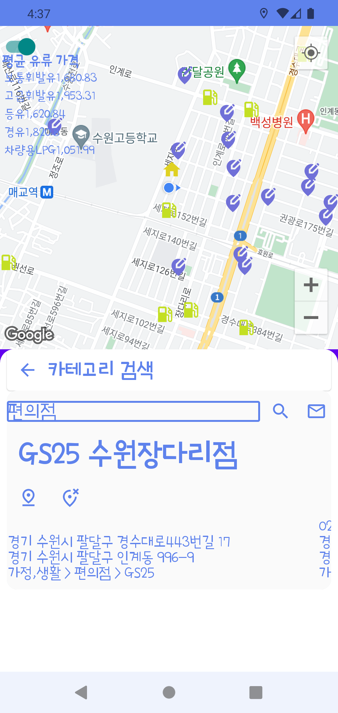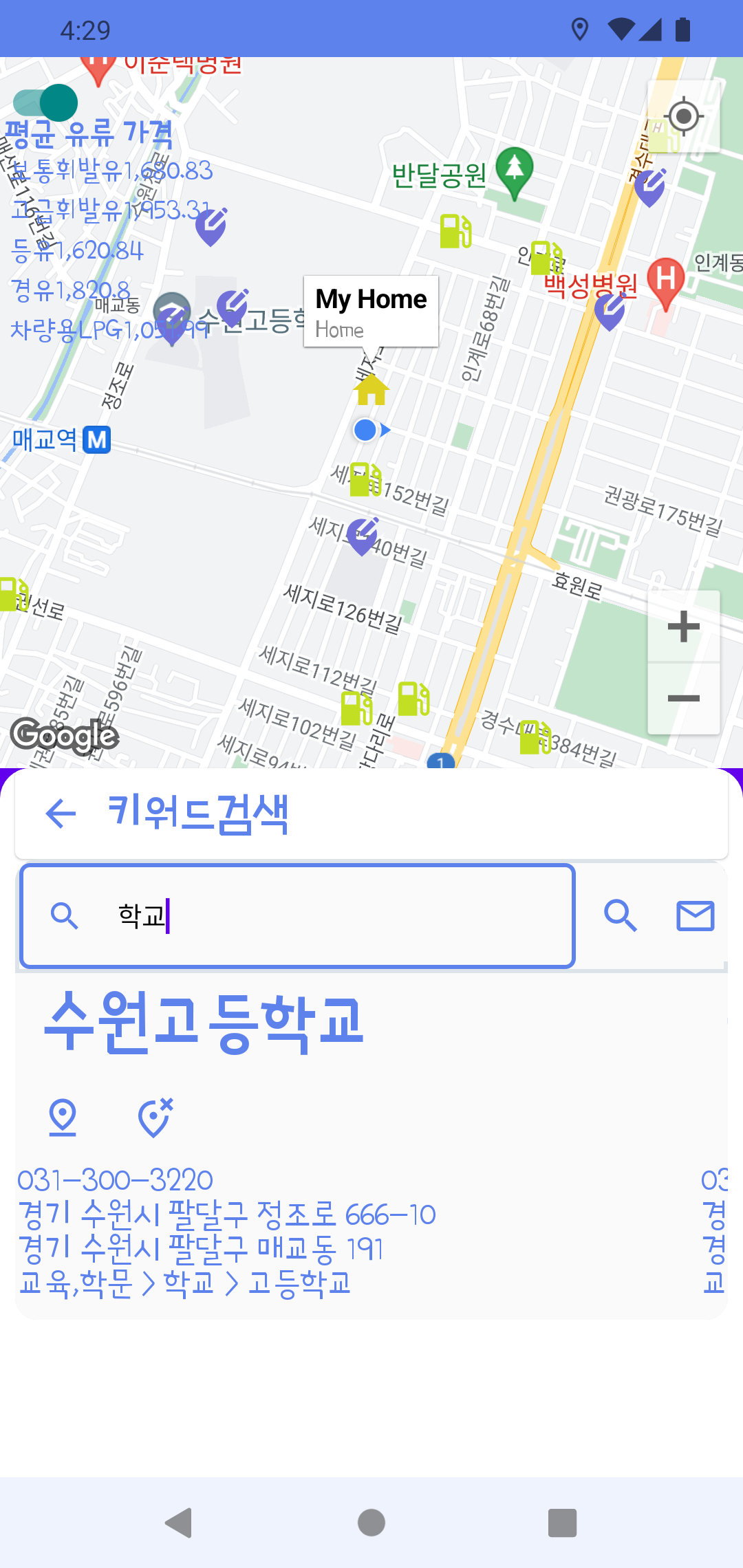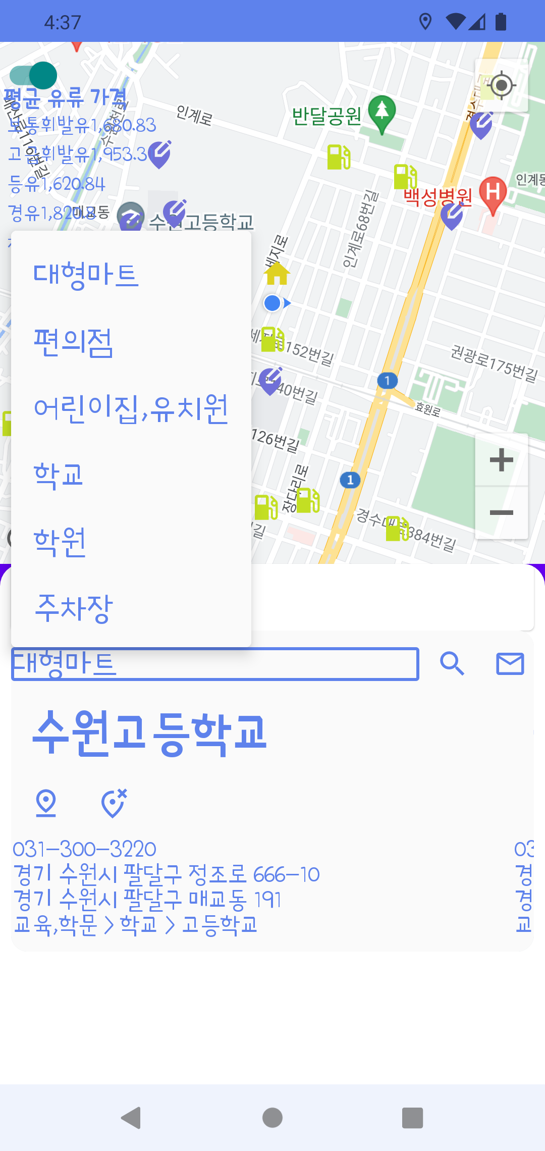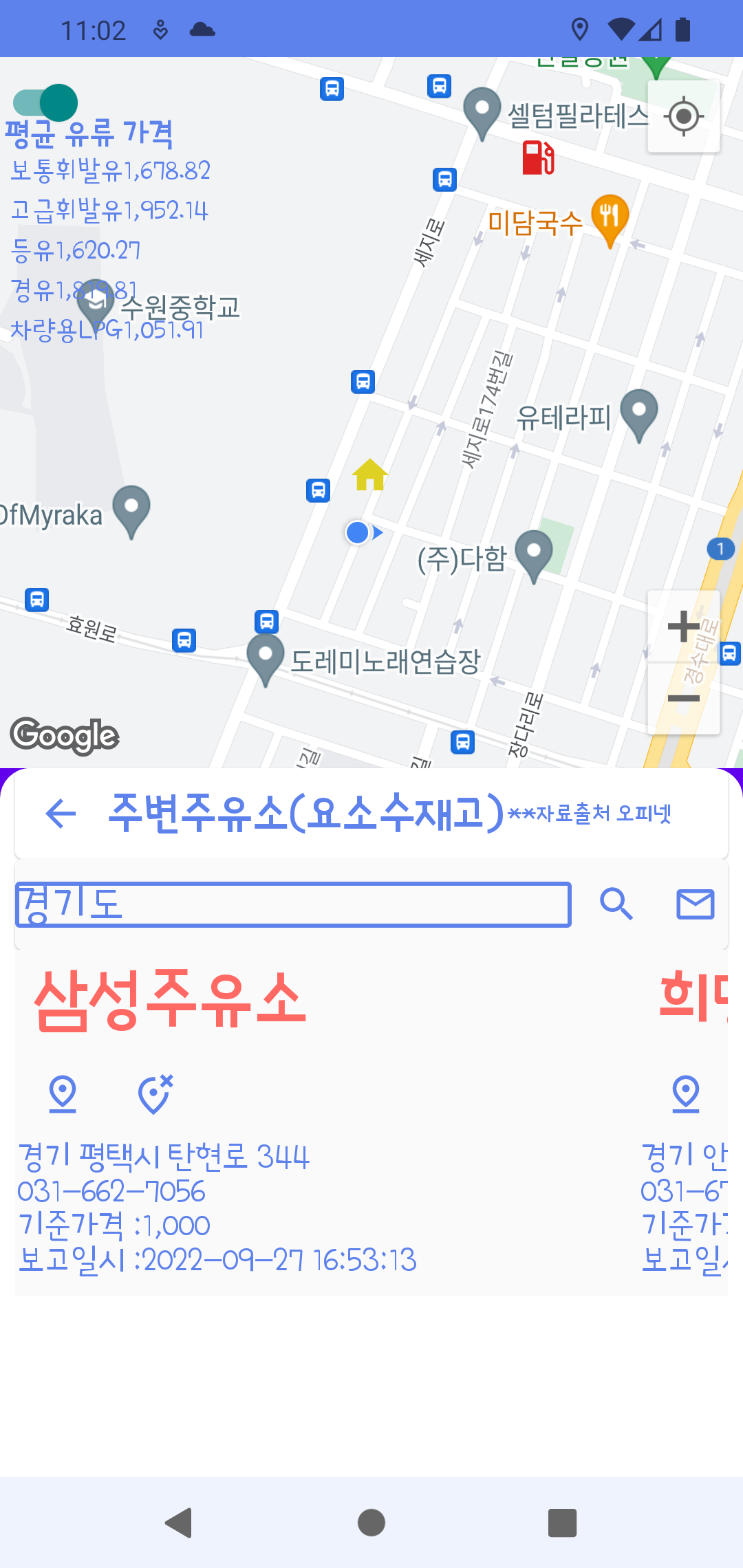 지도 화면에는 주변에 있는 주유소 위치 정보와 최근 우리 지역의 평균 유가정보를 표시합니다. (이것도 opinet에서 제공된 api을 활용합니다.)