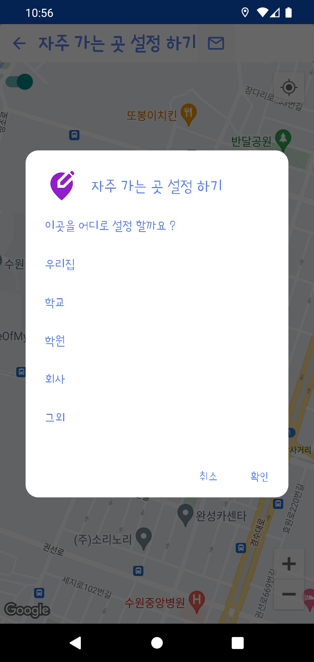 우리 집/ 회사 / 학교 / 학원 / 기타 등의 위치를 지도를 보면서 고정할 수 있습니다.