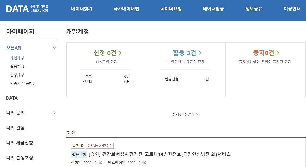 일단 내가 보고싶은 건 코로나 관련 병원정보 이력과 코로나 환자 발생현황 이다. 그중에 하나 신청한 내역은 위와 같다.