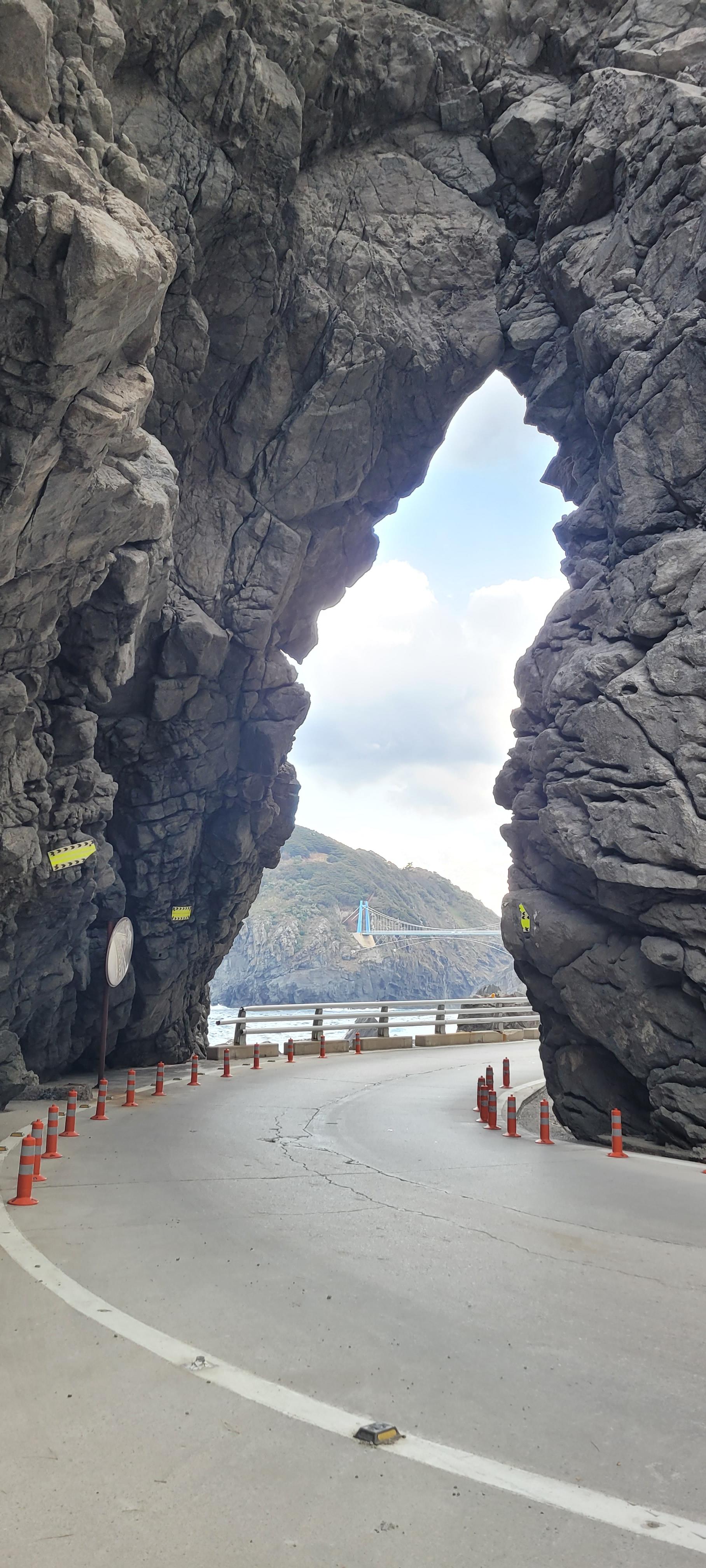 울릉도의 도로는 이게 일상입니다. 바위 사이에 도로가 있고 편도 1차선이 그냥 1차선이 되기도 합니다. 도로가 원활하지 못하기 때문에 중간중간에 터널을 만들어 일주도로를 만들었습니다. 배테랑이 아니면 운전을 하지 않는 게 좋을 것 같습니다.