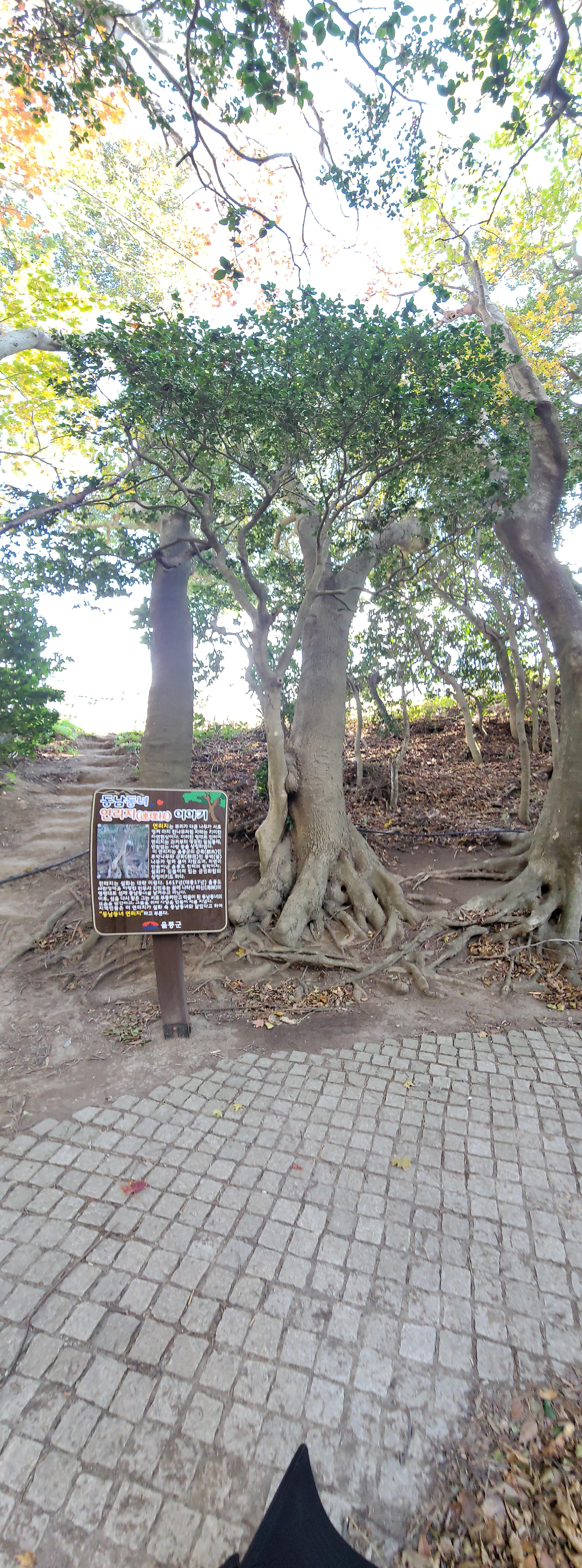 현포 근처에서 버스를 타고 태하리를 갔습니다. 여기에 모노레일이 있다는 정보(?)를 찾았거든요. 크~ 불행하게도 태하리의 모노레일은 23년 4월까지 공사를 합니다. 그래서 결국은 걸어 올랐습니다. 태하등대 전망대를 가기 위해서요. 한참을 올랐을 때 만난 나무입니다. 표지판이 말해 주는 것처럼 동백나무와 후박나무가 마치 하나가 된 것 처럼 자라는 모습을 보게 되었습니다.