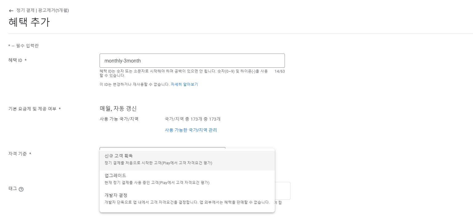 혜택 추가 하기에는 신규 고객을 선택하는 경우와 이전 사용자를 선택 하는 경우, 그 외 개발자의 임의 지정을 선택할 수 있을 듯합니다. 기존 고객을 위한 프로모션을 하는 경우도 있겠지만, 제가 배포한 앱은 아직 사용자가 없기 때문에 신규 고객을 대상으로 한 혜택 추가를 해 보겠습니다.