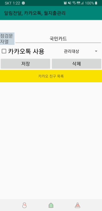 7. 점검문자열 메뉴를 들어가서 + 버튼을 클릭하여 점검문자열을 등록 합니다. 이 때 카카오톡 사용 여부를 체크 하여 카카오톡 친구 목록이 나오면 점검문자열에서 점검된 알림을 전달할 친구를 선택 합니다. (점검문자열을 등록할 때, 전달할 카카오톡 친구을 선택하지 않으면 해당 문자열의 내용은 본인의 카톡 메모로 전달 됩니다. 이 경우도 선택사항에서 카카오톡 전송을 선택한 경우만 적용 됩니다.) 친구를 추가하면 처음 1회 앱에 대한 사용 승인을 해야 이앱에서 친구 목록으로 조회가 됩니다. 알림을 공유할 친구들 모두가 이앱을 설치하고 사용승인이 될 수 있게 해 주세요.