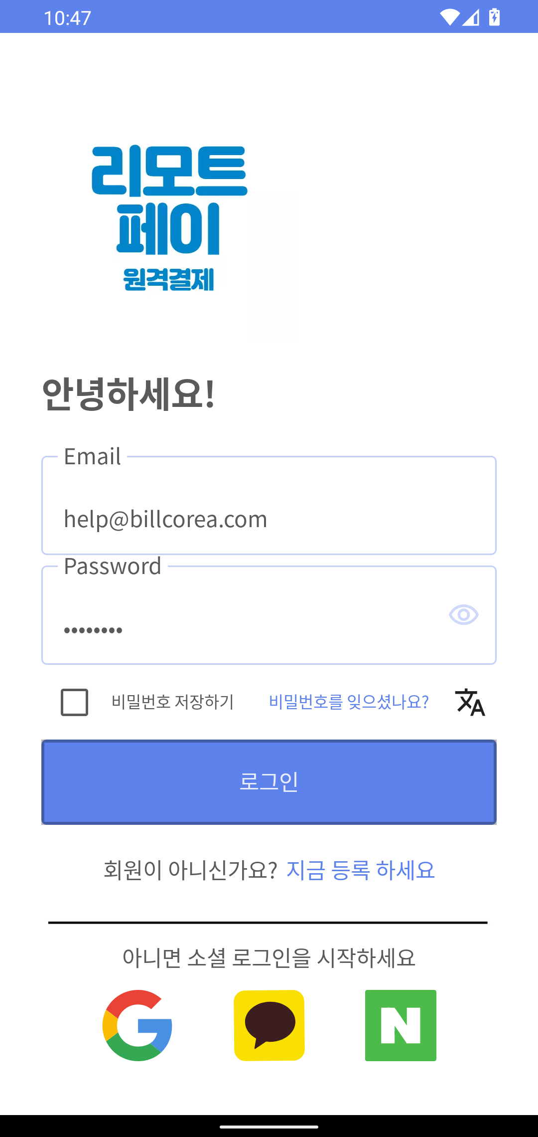 - 이메일 로그인 시 help@billcorea.com으로 password 1qazZAQ! 을 이용해 로그인해 볼 수 있습니다.