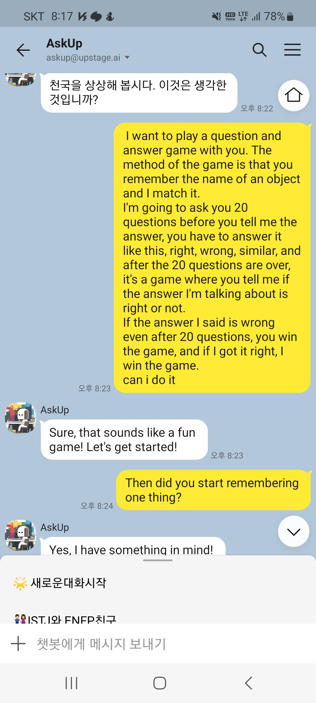 | 챗봇과 대화 놀이를 해 보다가... 스무고개 놀이를 챗봇이 알까요? (11) | 2023.03.09 |