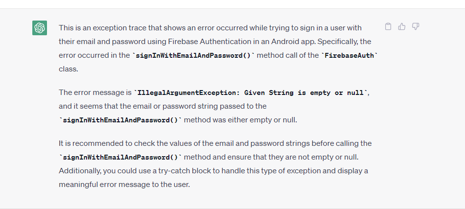 Exception java.lang.IllegalArgumentException: Given String is empty or null at com.google.android.gms.common.internal.Preconditions.checkNotEmpty (Preconditions.java) at com.google.firebase.auth.FirebaseAuth.signInWithEmailAndPassword (FirebaseAuth.java) at androidx.compose.foundation.gestures.TapGestureDetectorKt$detectTapAndPress$2$1.invokeSuspend (TapGestureDetector.kt) at kotlin.coroutines.jvm.internal.BaseContinuationImpl.resumeWith (BaseContinuationImpl.java) at kotlinx.coroutines.DispatchedTaskKt.resume (DispatchedTask.kt) at kotlinx.coroutines.CancellableContinuationImpl.tryResume (CancellableContinuationImpl.java) at kotlinx.coroutines.CancellableContinuationImpl.dispatchResume (CancellableContinuationImpl.java) at kotlinx.coroutines.CancellableContinuationImpl.resumeImpl (CancellableContinuationImpl.java) at kotlinx.coroutines.CompletionStateKt.toState (CompletionState.kt) at kotlinx.coroutines.CancellableContinuationImpl.resumeWith (CancellableContinuationImpl.java) at androidx.compose.ui.input.pointer.SuspendingPointerInputFilter.dispatchPointerEvent (SuspendingPointerInputFilter.java) at androidx.compose.ui.input.pointer.SuspendingPointerInputFilter.onPointerEvent-H0pRuoY (SuspendingPointerInputFilter.java) at androidx.compose.ui.node.BackwardsCompatNode.onPointerEvent-H0pRuoY (BackwardsCompatNode.java) at androidx.compose.ui.input.pointer.Node.dispatchMainEventPass (Node.java) at androidx.compose.ui.input.pointer.Node.dispatchMainEventPass (Node.java) at androidx.compose.ui.input.pointer.Node.dispatchMainEventPass (Node.java) at androidx.compose.ui.input.pointer.Node.dispatchMainEventPass (Node.java) at androidx.compose.ui.input.pointer.Node.dispatchMainEventPass (Node.java) at androidx.compose.ui.input.pointer.NodeParent.dispatchMainEventPass (NodeParent.java) at androidx.compose.ui.input.pointer.HitPathTracker.dispatchChanges (HitPathTracker.java) at androidx.compose.ui.input.pointer.PointerInputEventProcessor.process-BIzXfog (PointerInputEventProcessor.java) at androidx.compose.ui.platform.AndroidComposeView.sendMotionEvent-8iAsVTc (AndroidComposeView.java) at androidx.compose.ui.platform.AndroidComposeView.handleMotionEvent-8iAsVTc (AndroidComposeView.java) at androidx.compose.ui.platform.AndroidComposeView.dispatchTouchEvent (AndroidComposeView.java) at android.view.ViewGroup.dispatchTransformedTouchEvent (ViewGroup.java:3030) at android.view.ViewGroup.dispatchTouchEvent (ViewGroup.java:2719) at android.view.ViewGroup.dispatchTransformedTouchEvent (ViewGroup.java:3030) at android.view.ViewGroup.dispatchTouchEvent (ViewGroup.java:2719) at android.view.ViewGroup.dispatchTransformedTouchEvent (ViewGroup.java:3030) at android.view.ViewGroup.dispatchTouchEvent (ViewGroup.java:2719) at android.view.ViewGroup.dispatchTransformedTouchEvent (ViewGroup.java:3030) at android.view.ViewGroup.dispatchTouchEvent (ViewGroup.java:2719) at com.android.internal.policy.DecorView.superDispatchTouchEvent (DecorView.java:440) at com.android.internal.policy.PhoneWindow.superDispatchTouchEvent (PhoneWindow.java:1830) at android.app.Activity.dispatchTouchEvent (Activity.java:3400) at com.android.internal.policy.DecorView.dispatchTouchEvent (DecorView.java:398) at android.view.View.dispatchPointerEvent (View.java:12752) at android.view.ViewRootImpl$ViewPostImeInputStage.processPointerEvent (ViewRootImpl.java:5106) at android.view.ViewRootImpl$ViewPostImeInputStage.onProcess (ViewRootImpl.java:4909) at android.view.ViewRootImpl$InputStage.deliver (ViewRootImpl.java:4426) at android.view.ViewRootImpl$InputStage.onDeliverToNext (ViewRootImpl.java:4479) at android.view.ViewRootImpl$InputStage.forward (ViewRootImpl.java:4445) at android.view.ViewRootImpl$AsyncInputStage.forward (ViewRootImpl.java:4585) at android.view.ViewRootImpl$InputStage.apply (ViewRootImpl.java:4453) at android.view.ViewRootImpl$AsyncInputStage.apply (ViewRootImpl.java:4642) at android.view.ViewRootImpl$InputStage.deliver (ViewRootImpl.java:4426) at android.view.ViewRootImpl$InputStage.onDeliverToNext (ViewRootImpl.java:4479) at android.view.ViewRootImpl$InputStage.forward (ViewRootImpl.java:4445) at android.view.ViewRootImpl$InputStage.apply (ViewRootImpl.java:4453) at android.view.ViewRootImpl$InputStage.deliver (ViewRootImpl.java:4426) at android.view.ViewRootImpl.deliverInputEvent (ViewRootImpl.java:7092) at android.view.ViewRootImpl.doProcessInputEvents (ViewRootImpl.java:7061) at android.view.ViewRootImpl.enqueueInputEvent (ViewRootImpl.java:7022) at android.view.ViewRootImpl$WindowInputEventReceiver.onInputEvent (ViewRootImpl.java:7195) at android.view.InputEventReceiver.dispatchInputEvent (InputEventReceiver.java:186) at android.os.MessageQueue.nativePollOnce at android.os.MessageQueue.next (MessageQueue.java:326) at android.os.Looper.loop (Looper.java:160) at android.app.ActivityThread.main (ActivityThread.java:6669) at java.lang.reflect.Method.invoke at com.android.internal.os.RuntimeInit$MethodAndArgsCaller.run (RuntimeInit.java:493) at com.android.internal.os.ZygoteInit.main (ZygoteInit.java:858)