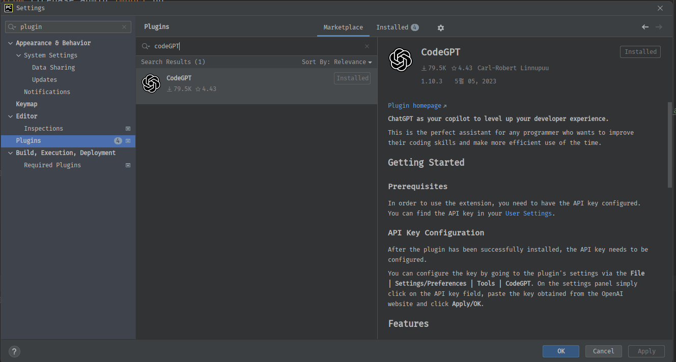 먼저 할 일은 Setting - plugin 에서 codeGPT 을 찾아서 설치를 해 보는 것입니다.