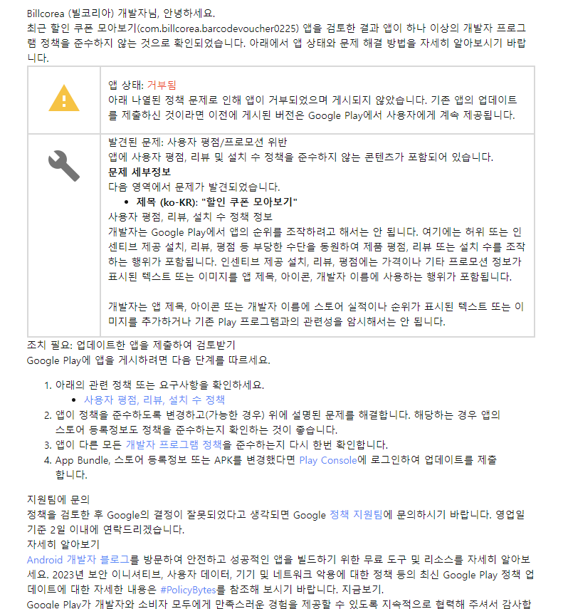 앱의 제목에 '할인 쿠폰 모아보기' 라는 제목을 정해서 릴리즈 요청을 드렸더니... 이런 메일이 왔지 먼가요?