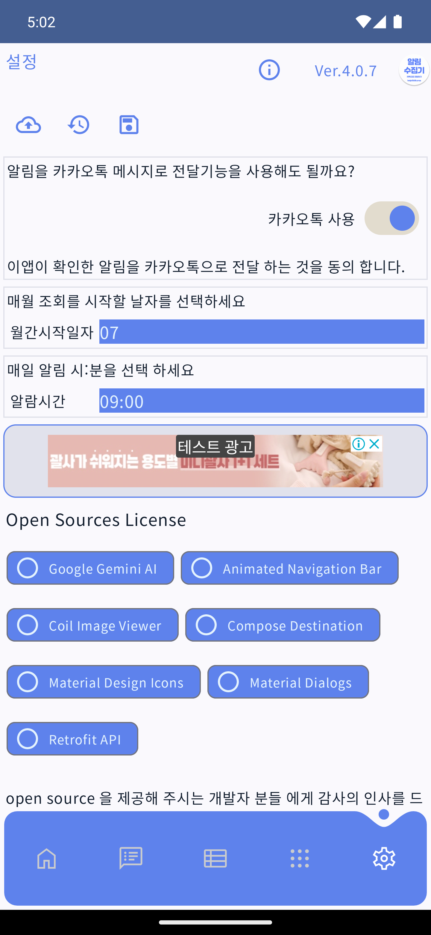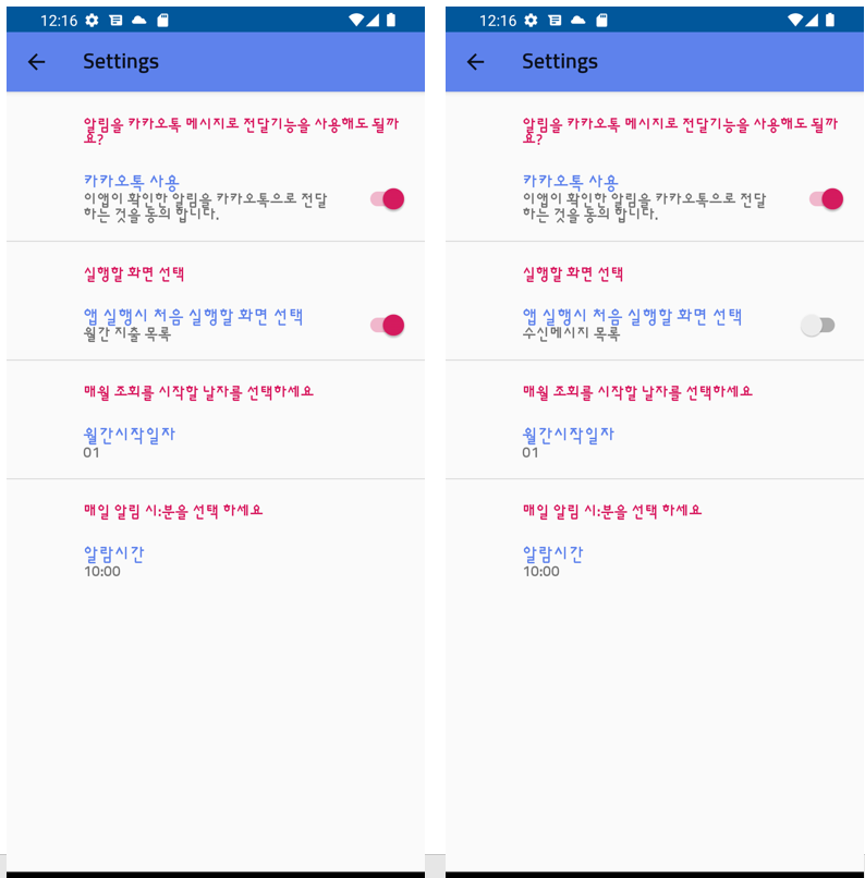 매일 알림 시:분은 당일에 지출해야할 금액을 매일 알림을 통해 알려 줍니다. 다만, 안드로이드가 지원하는 worker 처리 방식을 따라가다 보니, 지정한 시간에서 오차가 일부 있을 수 있습니다.