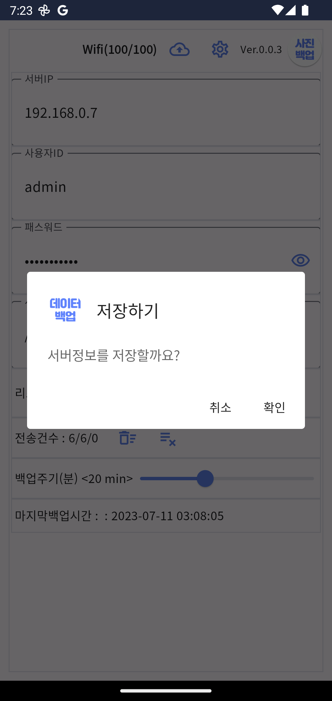 15분 미만으로 설정한 경우에는 백업 버튼을 클릭하기 전에 리스트 보기를 활성화해서 사진 목록이 조회되는 것으로 확인해야 합니다.