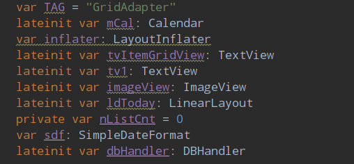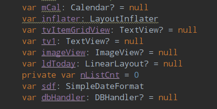 이렇게 null 로 초기화를 해야만 하는 가 봅니다. kotlin 에는 초기화를 나중에 하는 유용한 방법이 있는 데도 말입니다. 그래서 다음과 같이 변경을 해 주면 해결이 됩니다.
