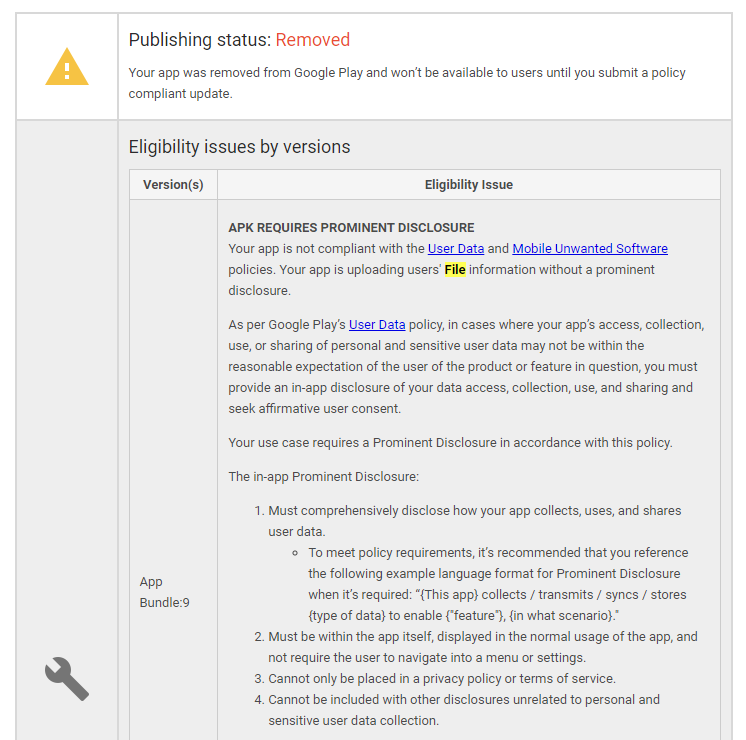 | App Bundle:9 | APK REQUIRES PROMINENT DISCLOSURE Your app is not compliant with the User Data and Mobile Unwanted Software policies. Your app is uploading users' File information without a prominent disclosure. As per Google Play’s User Data policy, in cases where your app’s access, collection, use, or sharing of personal and sensitive user data may not be within the reasonable expectation of the user of the product or feature in question, you must provide an in-app disclosure of your data access, collection, use, and sharing and seek affirmative user consent. Your use case requires a Prominent Disclosure in accordance with this policy. The in-app Prominent Disclosure: