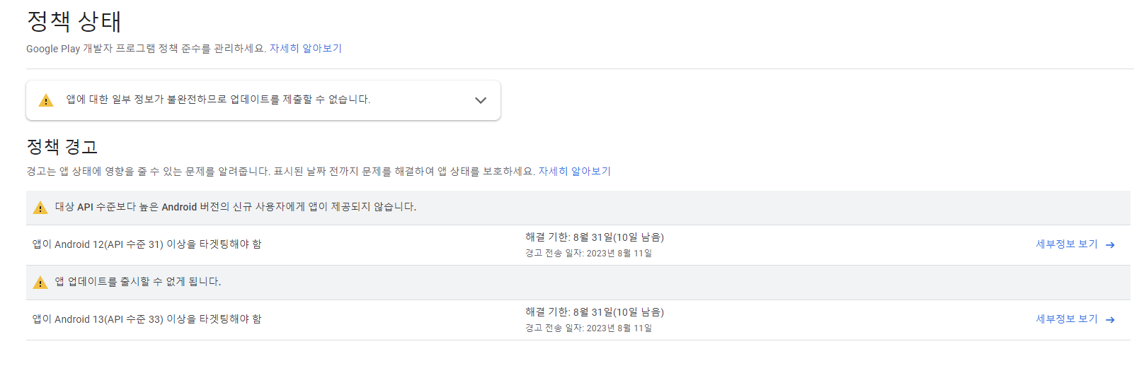 | 안드로이드 앱 만들기 : 구글에서 보낸 경고 메일 (게시 취소됨) (15) | 2023.08.21 |