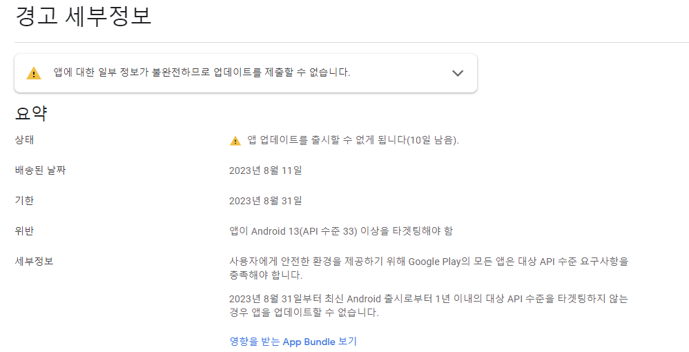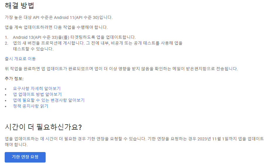 결국 playstore 가 요구 하는 게시 기준은 API 33 ( 안드로이드 13) 이상이 되어야 한다는 것입니다. 이제 이전 안드로이드 폰이 얼마나 되는지는 알 수 없으나, 더 이상은 게시를 할 수 없다는 이야기가 될 것 같습니다.