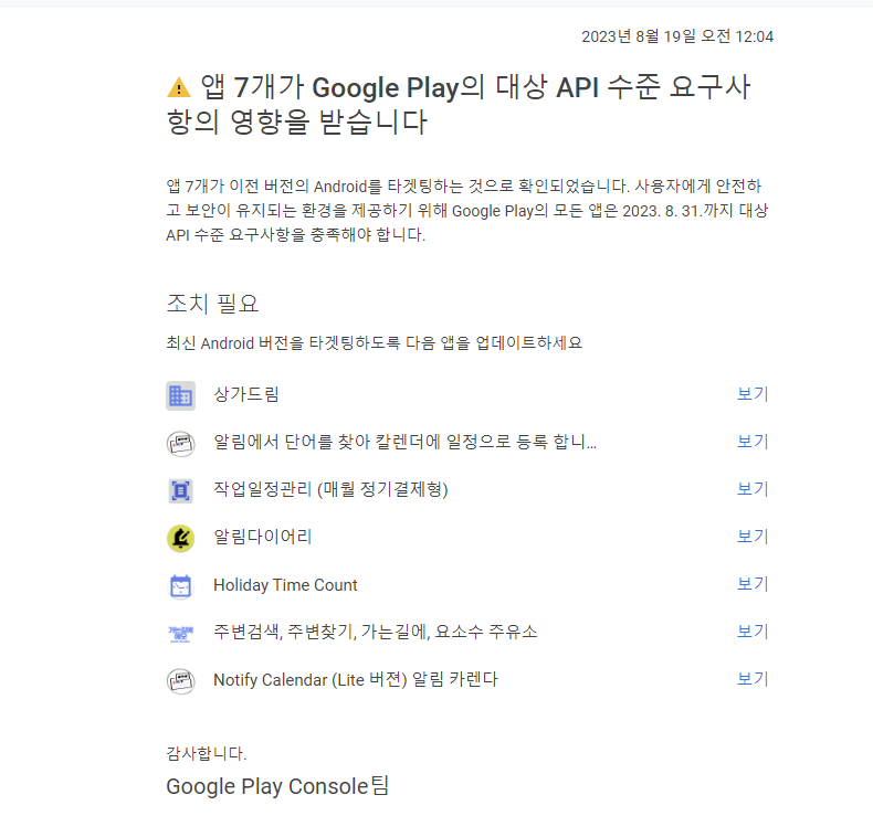 이전에 게시했던 앱들 중에서 관리가 소홀한 앱들에 대한 경고 메일을 받았습니다. 이것들을 8.31까지 정리해야 한다고 합니다.