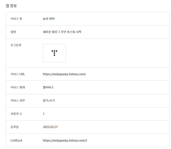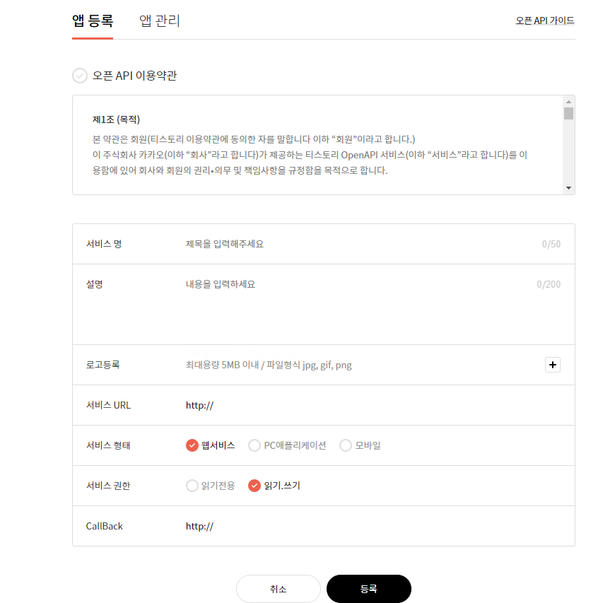 그전에 앱 등록을 해야 합니다. https://www.tistory.com/guide/api/manage/register 에서 아래 그림과 같이 나오면 등록을 해 줍니다.