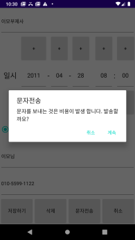 – 문자전송 : 일정 수정화면에서 문자전송을 클릭한 경우 나타나며, 구글의 정책에 따라 직접 SMS전송을 하지 않고, SMS 전송 문자앱으로 전화번호 와 문구를 전달해 드립니다.
