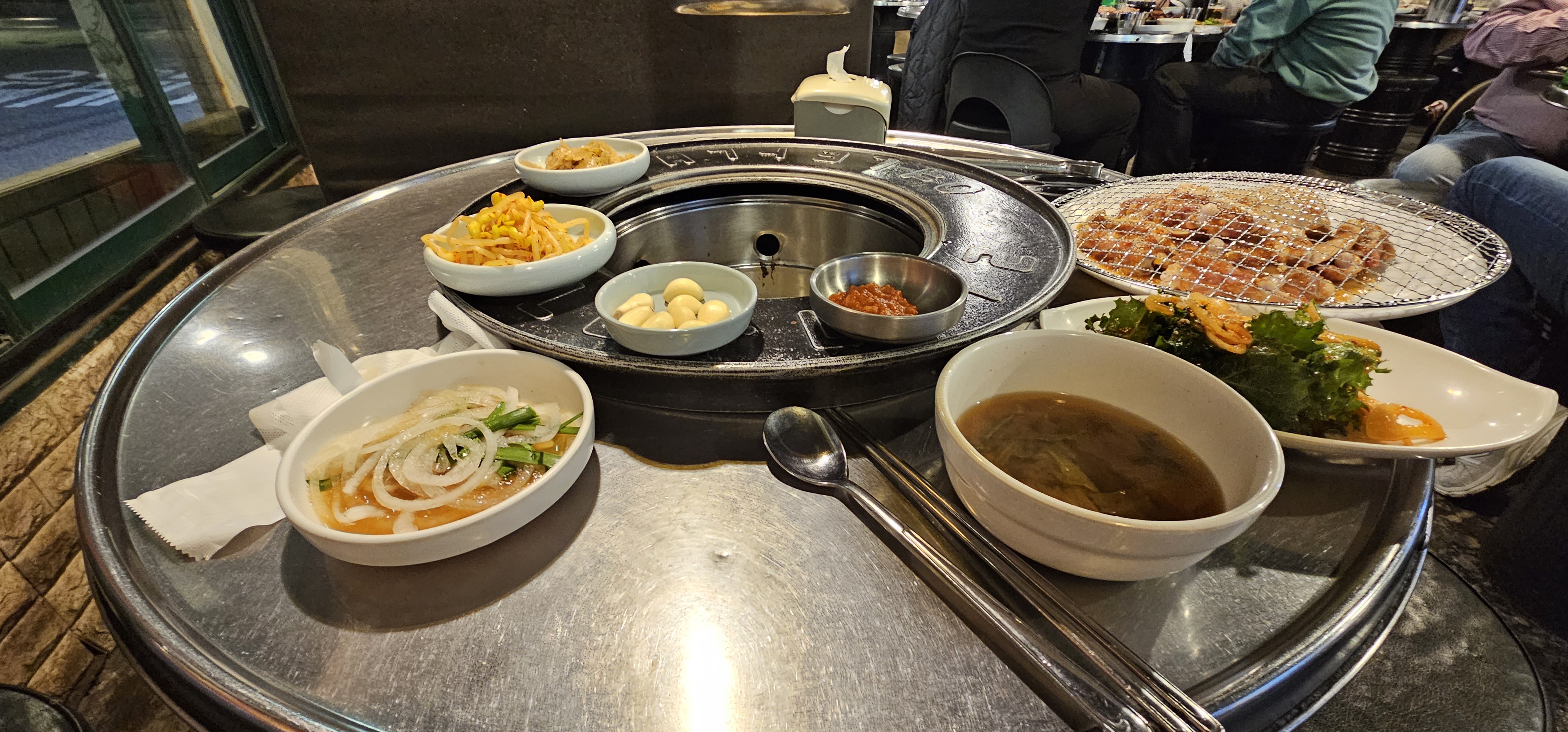혼자 2인분을 먹고 왔더니, 동네 한 바퀴 돌아야 할 것 같은 생각이 들기는 합니다. 맛은 그냥 나쁘지 않았습니다. 상추는 처음에 주시지 않았는 데, 반찬 리필을 하려고 갔더니, 거기에는 있더군요. 다만, 상추 꽁지에 흙 묻었던 흔적이 세척이 되지 않은 듯하기도 하고, 남은 고기가 별로 없기도 해서 그냥 왔습니다. 상추 + 양파 + 미역 + 초고추장(?) 무침에 싸 먹었더니 매콤함이 입맛에 맞기도 했습니다.
