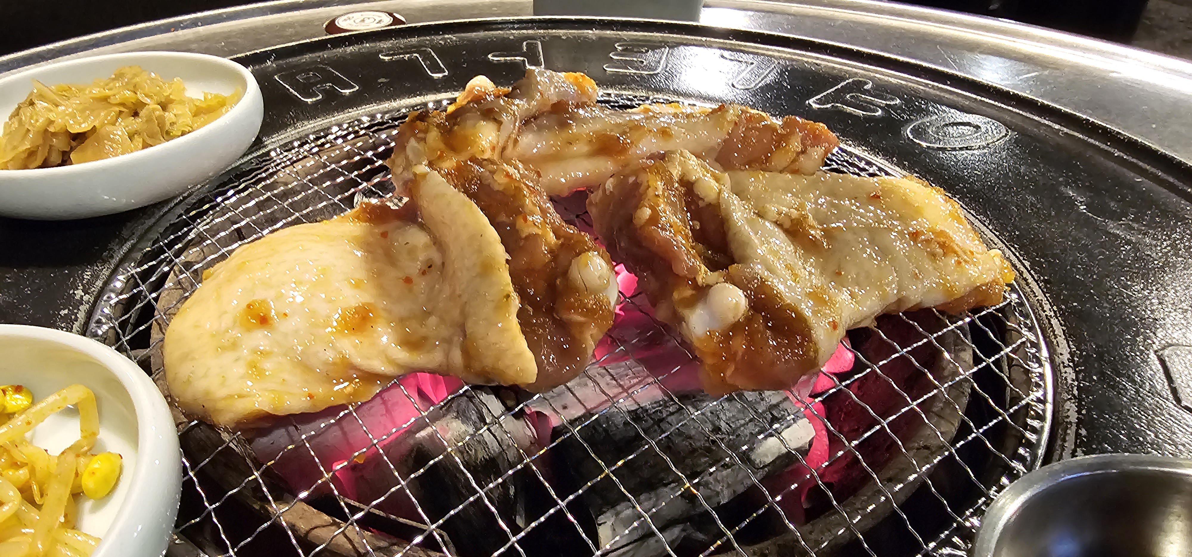 연탄불이라는 식당 이름 때문에 연탄불을 생각했는 데, 숯불을 가져다주셨습니다. 좀 생경하기는 합니다.