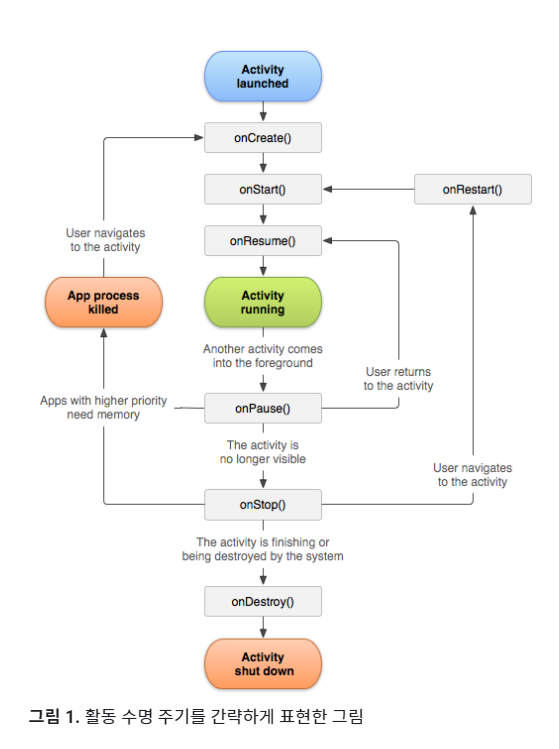 먼저 activity 의 lifecycle 을 대해서 찾아볼 필요가 있다. 왜 그런가 하면 액티비티가 생성되면서 어느 시점에 화면을 다시 그리게 할 것인가를 정해야 할 것 같아서 이다. 개발자 페이지에서 받아온 이미지 하나를 링크을 달았다.