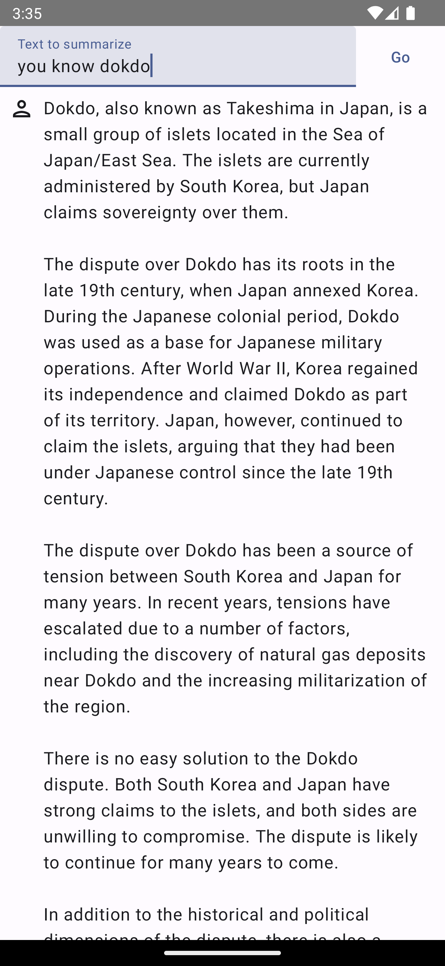 **다만, 독도에 대한 의견을 요약해 달라고 했더니, 조금 미흡한 결과를 보여 주기는 했습니다. 우리가 생각하는 것처럼, 조선 시대 등의 이야기는 연관시켜 답을 주지 않기 때문입니다.
