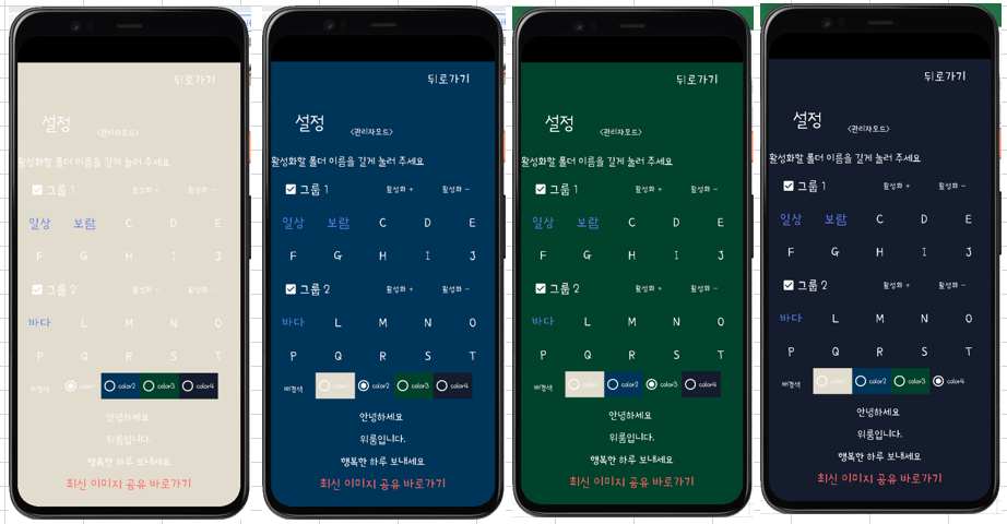 기본테마 Theme.Weroom714 부터 Theme.Weroom714_darkGreen, Theme.Weroom714_darkBlue, Theme.Weroom714_softBlack 까지 사용자는 4개의 색상 조합을 요청했다. 자세히 살펴 보면 다른 건 없고, 배경색만 다르게 지정하는 구성이다.
