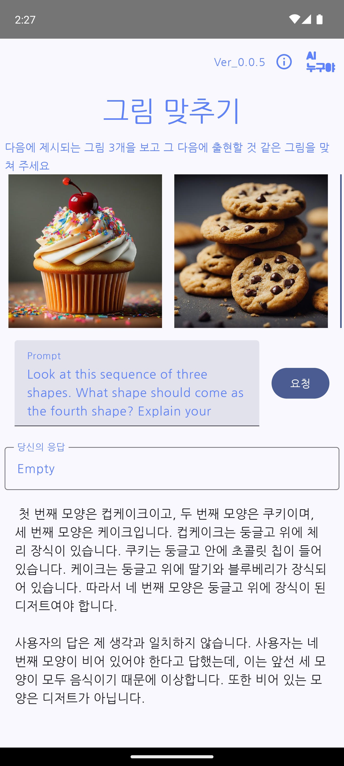 이 앱은 간단한 그림 3개을 보여 주고 그 다음에 출현 가능한 이미지을 말해 보는 앱 입니다. 이 앱은 Gemini AI 와 대화을 시도 합니다.