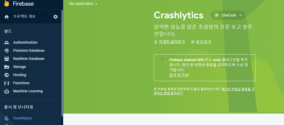이 코드는 고민할 것도 없다. MainActivity 의 onCreate 에 넣고 실행하면 화면에 내가 design 하지 않은 버튼이 하나 나온다. Test Crash 라고 ... 그럼 그냥 한번 눌러주면 Firebase 의 console 화면이 변한다.. 아래 그림 처럼