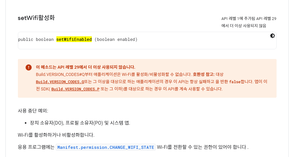 앱을 하나 만들고 있다. geoFences 을 이용해서 내가 지금 어디에 있는가를 보고 자동으로 설정을 하거나 알림을 하는 앱을 ... 그런데, 난관(?)이 하나 생겼다. 집을 나오면 wifi을 끄고, 다시 집에 오면 wifi 을 자동으로 켜는 기능을 넣고 싶었는데, 내가 지금 쓰는 폰이 API가 29 (Android 10) 이상이라는 상황 때문에 wifimanager 의 기능중에 setWifiEnabled 을 사용할 수 없다는 것이다.