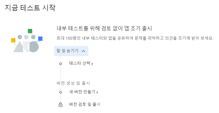테스트 시작을 통해서 내부테스트/ 공개테스트 / 비공개 테스트 등을 선택할 수 있다. 바로 앱 등록을 할 수 도 있지만,