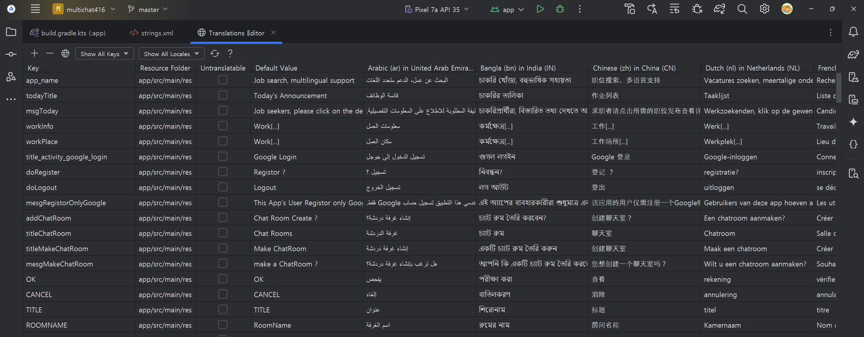 android studio 에서 번역이 완료 되었는 지를 먼저 확인해 보았습니다. 외국어를 다 알지 못하는 입장(?)에서는 정상적으로 번역이 된 것 처럼 보입니다. 이제 빌드를 해 보겠습니다.