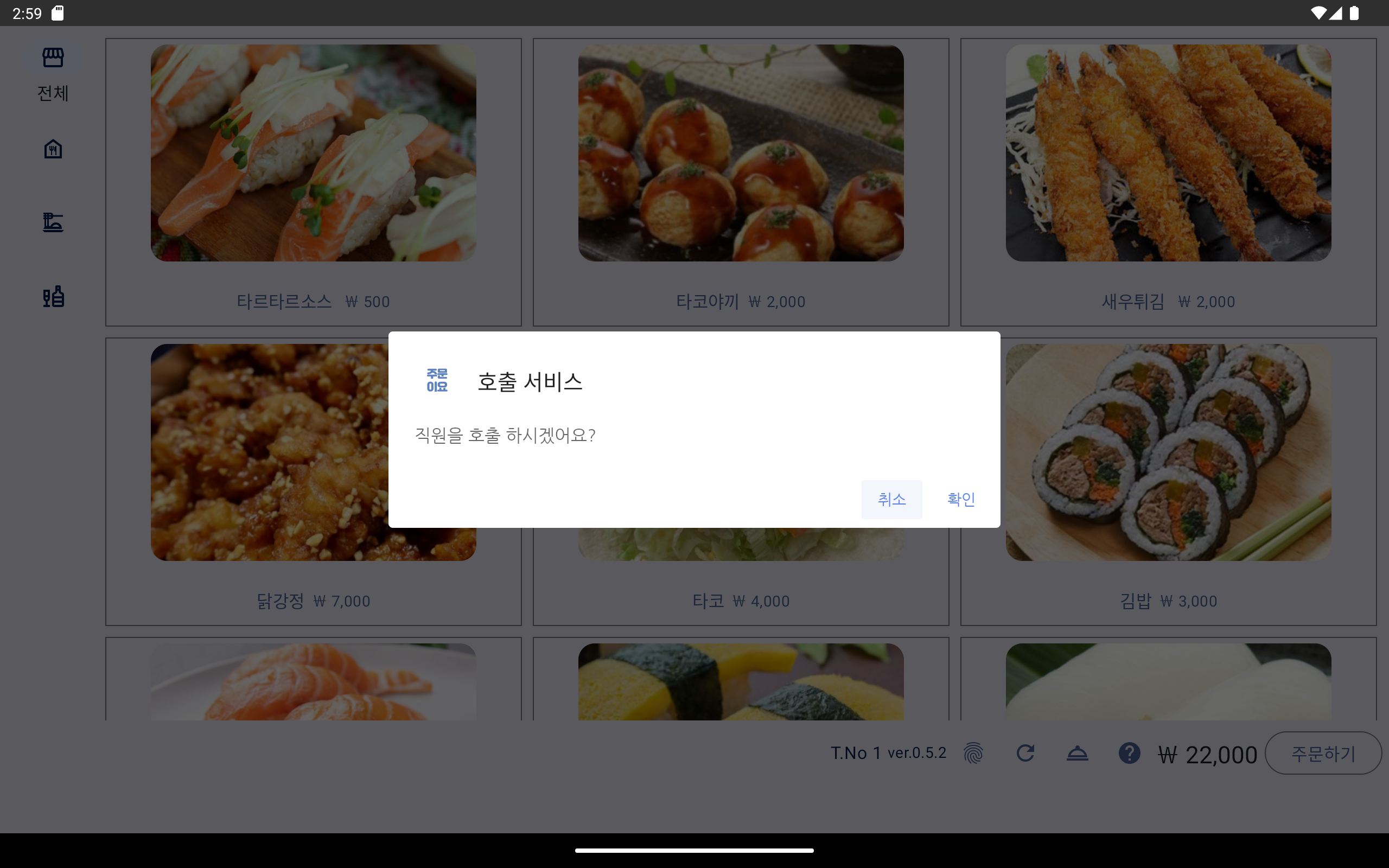 화면 하단의 직원호출 (벨 모양)을 클릭 하면 알림창이 나오고 알림창에서 선택시 주방으로 직원 호출 알림이 전달 됩니다.
