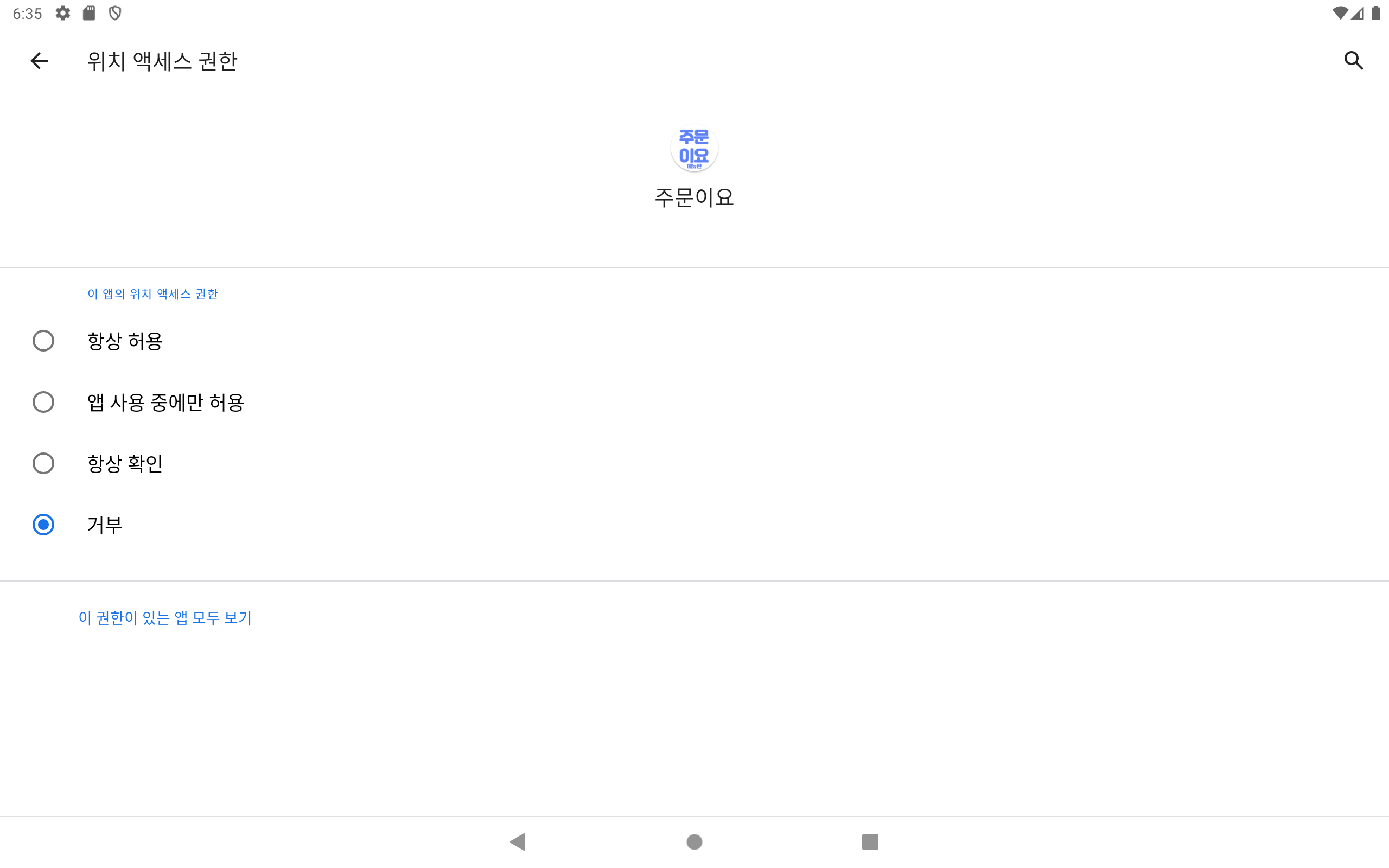 이 앱은 항상 허용으로 설정해 주어야 위치 확인을 할 수 있습니다. 기기 분실시 정보 획득이 필요하시면 설정 하시고 그렇지 않은 경우 설정 하지 않아도 메뉴판 기능의 사용에는 영향을 주지 않습니다.